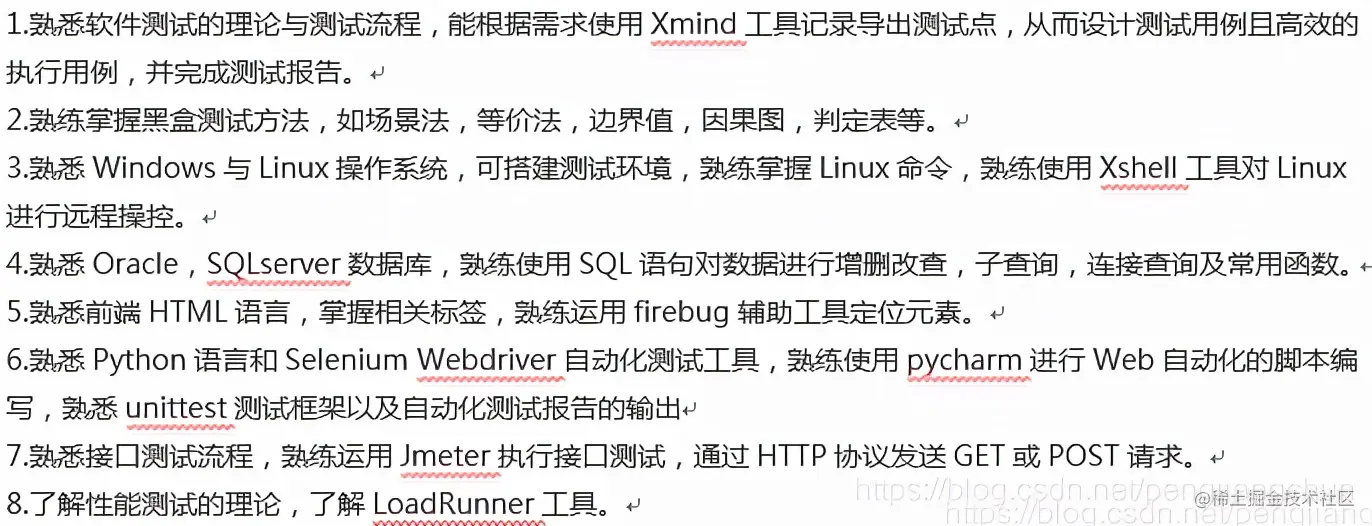 1.个人建议一般要写8条以上,包括数据库,Linux,测试理论,接口测试,自动化测试或性能测试选其一!