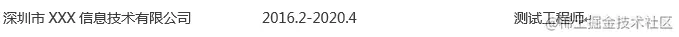1.一般格式为:深圳市XXX信息技术有限公司 2018.4-2020.4 软件测试工程师