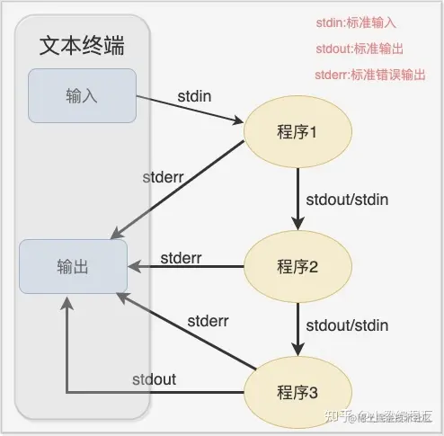 早期 Unix 中的进程真的不能做得更多。有一个pipe(2)[匿名管道],又抽象出一个叫命名管道的技术,但仅此而已。上一个匿名管道的stdin(标准输入)可以作为下一个管道的stdout(标准输出)或stderr(标准错误输出),如下图所示