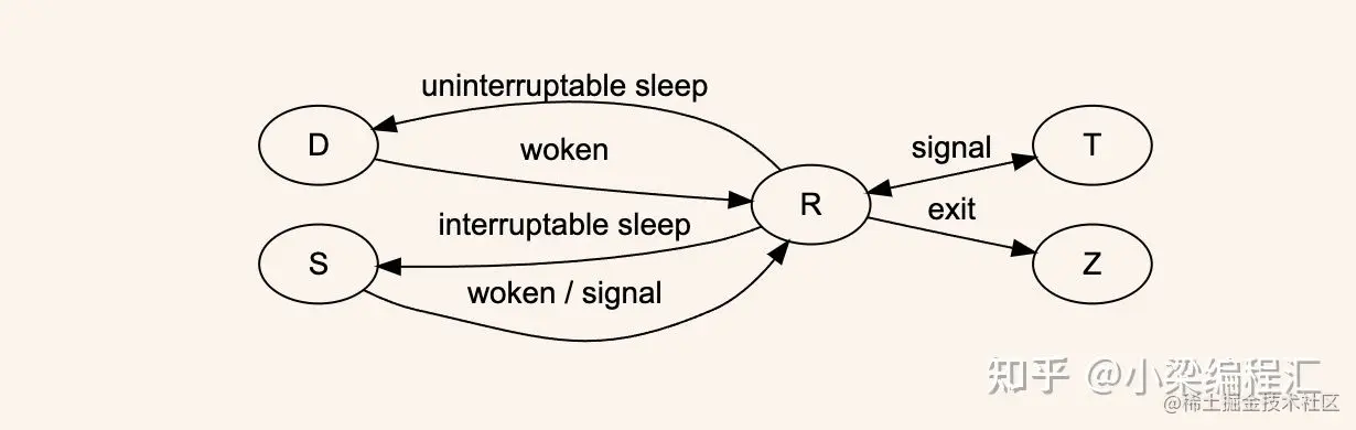 一个进程的生命周期以 R“运行”状态开始,以其父进程从 Z“僵尸”状态回收它后结束。下图是其状态流转