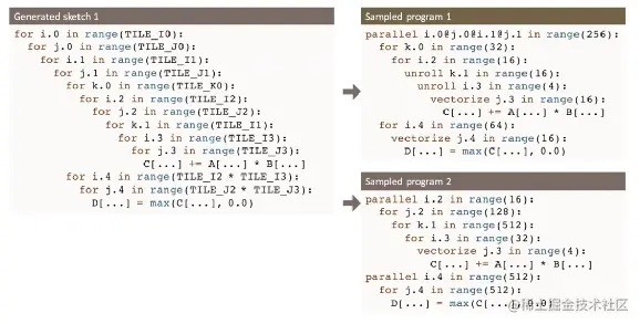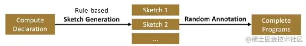 program sampling 的目标是自动地构建一个连续的大的搜索空间。这里要理解这个搜索空间到底是用于搜索个啥,我的理解是搜索计算的姿势或者说计算的调度方式,而不是计算本身。方法是使用 sketch generation 和 random annotation。其中 sketch 是 a few good high-level structures,annotaion 是 billions of low-level details,通俗一点理解 sketch 进行高层抽象,annotaion 进行底层映射,通过这两步操作就能构建了一个很大的搜索空间。