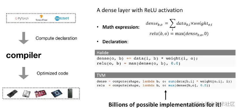 对于深度学习编译器来说,就是把前端 AI 框架出来的网络 / 算子 code_gen / compiler 成对应 target 硬件后端高性能的机器码,而 tvm / halide 把这个compiler 的过程拆成计算(compute)和调度(optimized code)两个过程,理由很简单,这样解耦后只需要关注调度优化,因为调度是和硬件强相关的,而不用担心调度影响了精度。拿 dense_layer + relu 这个 subgraph 来说,halide 和 tvm 的计算表达可能是这样的: