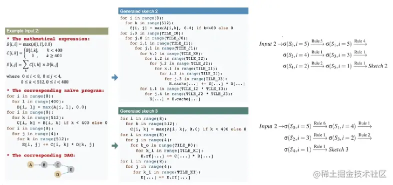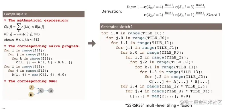 做法大致流程是这样:先出数学表达 -> 再出程序表达 -> 根据程序表达和数学表达出有向无环图描述计算节点和计算逻辑 -> 根据设计好的 sketch gen rules 来生成 sketch 表达(比如对于CPU,有 “SSRSRS”的循环展开结构)。所以 sketch 的整个流程可以用如下这个 dense_layer + relu 的例子展示,可以看到最后生成的 sketch 草图里有很多类似 TILE_I0 的参数,这些是超参,是需要调优搜索的值,也是 random annotation 的工作之一,所以最后生成的 sketch 草图不止一个,往往是一个草图列表。