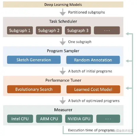 接着 program sampling 后的操作就到了 performance tuner 了。这里这要包含搜索算法设计和代价评估模型的设计,使 ansor 能够更加高效的进行搜索和收敛。