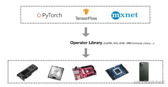 深度学习系统堆栈,前端是各种 AI 框架(pytorch、tf、mxnet、caffe ... ),后端是各种硬件(NVGPU、ARMCPU、X86CPU、NPU ... )