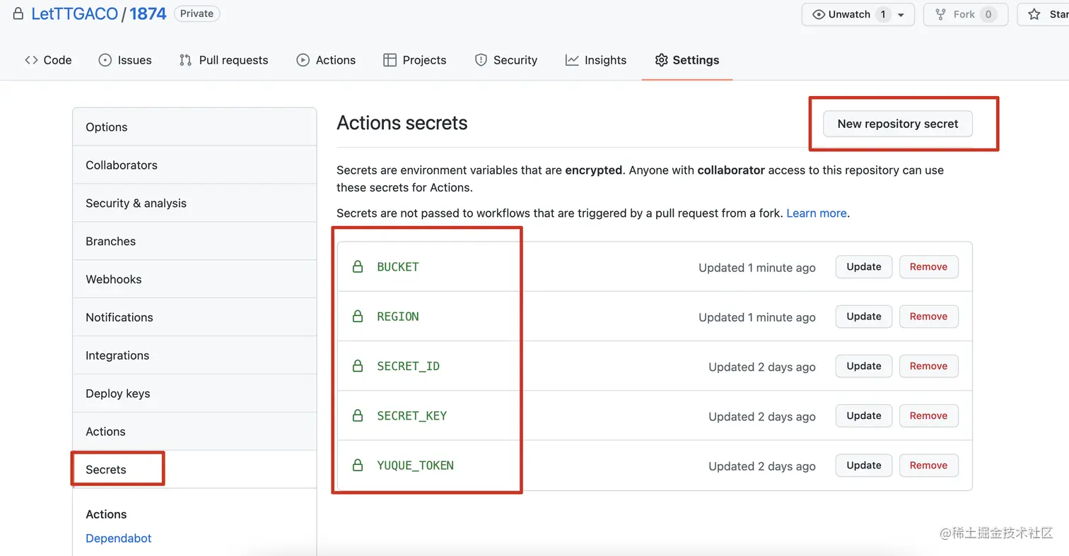进入博客仓库的设置,配置 secrets。把之前获取的腾讯云的SECRET_ID 和 SECRET_KEY和语雀的YUQUE_TOKEN配置到这里。