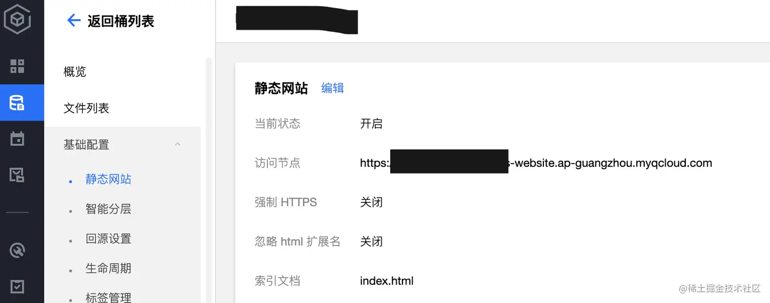访问腾讯云对象存储控制台=>基础配置=>静态网站,开启静态网站功能