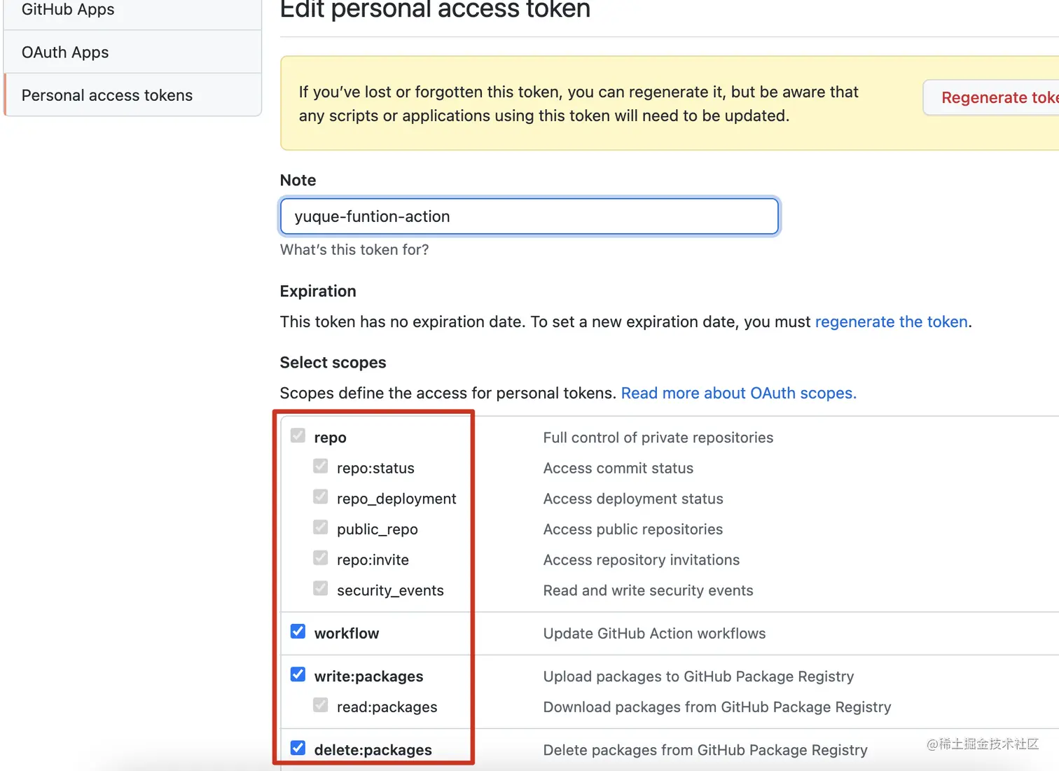 注意下:这个 Token 只会出现一次,最好复制出来使用,如果忘记了,只能重新生成一个