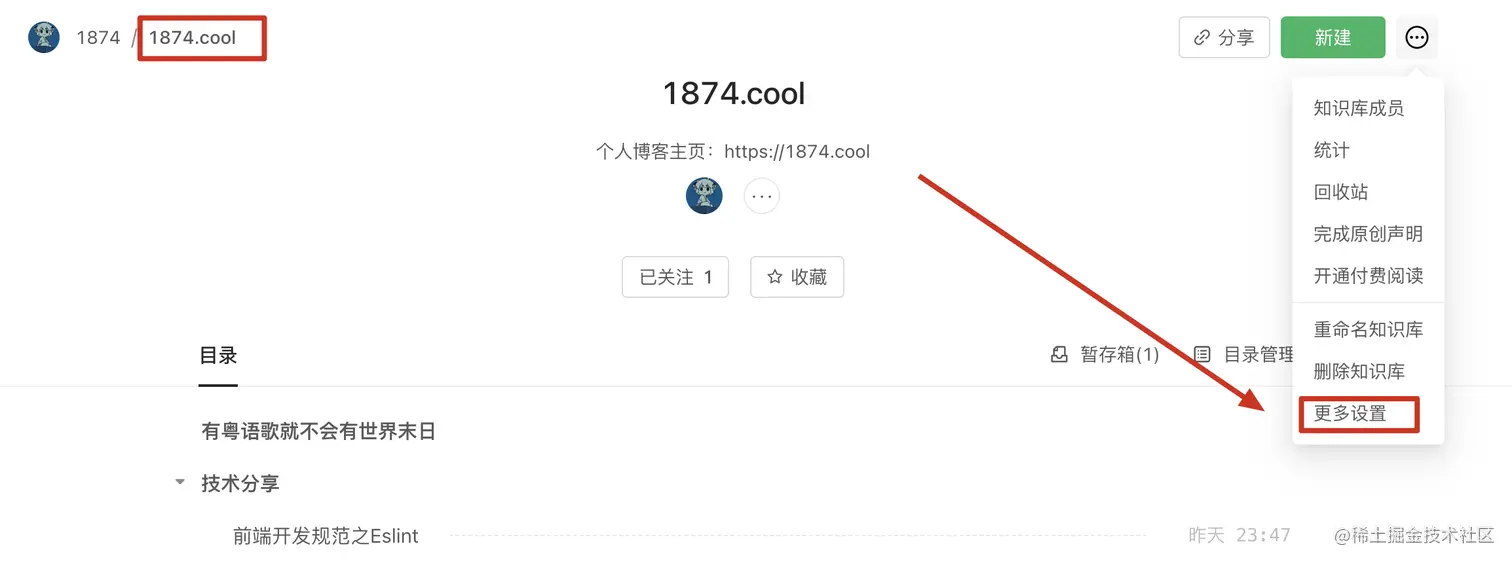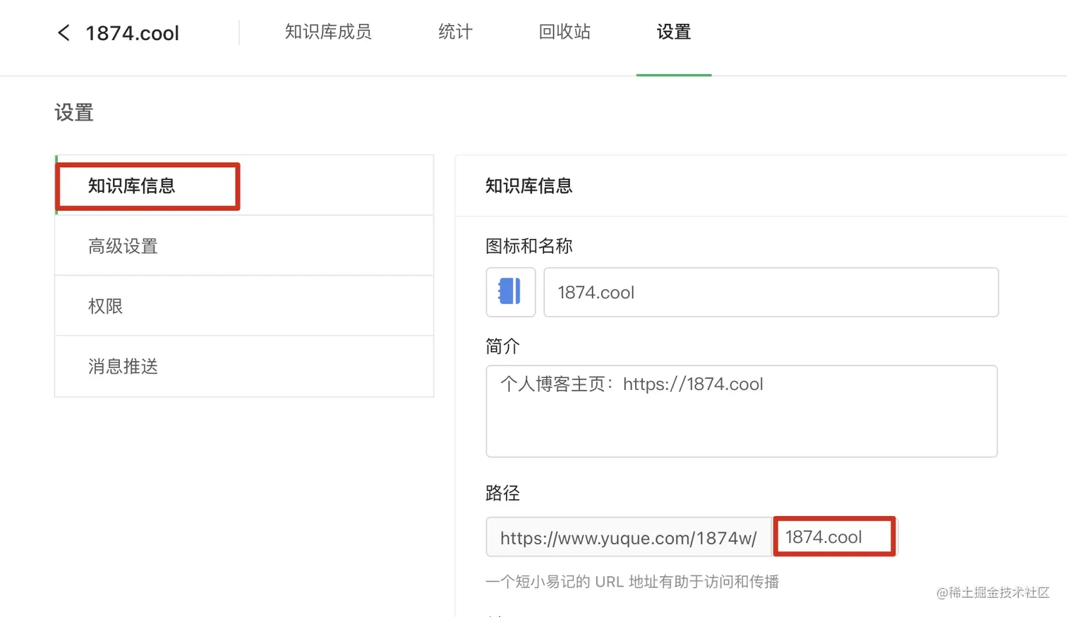 - 进入博客知识库,设置博客知识库的路径(建议),拿到知识库的路径。