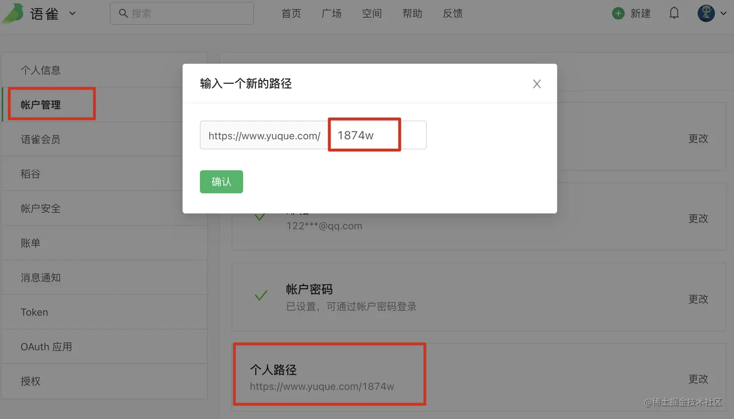 - 访问工作台=>账户设置=>账户设置=>个人路径,设置语雀的简易的个人路径(建议),拿到个人路径。
