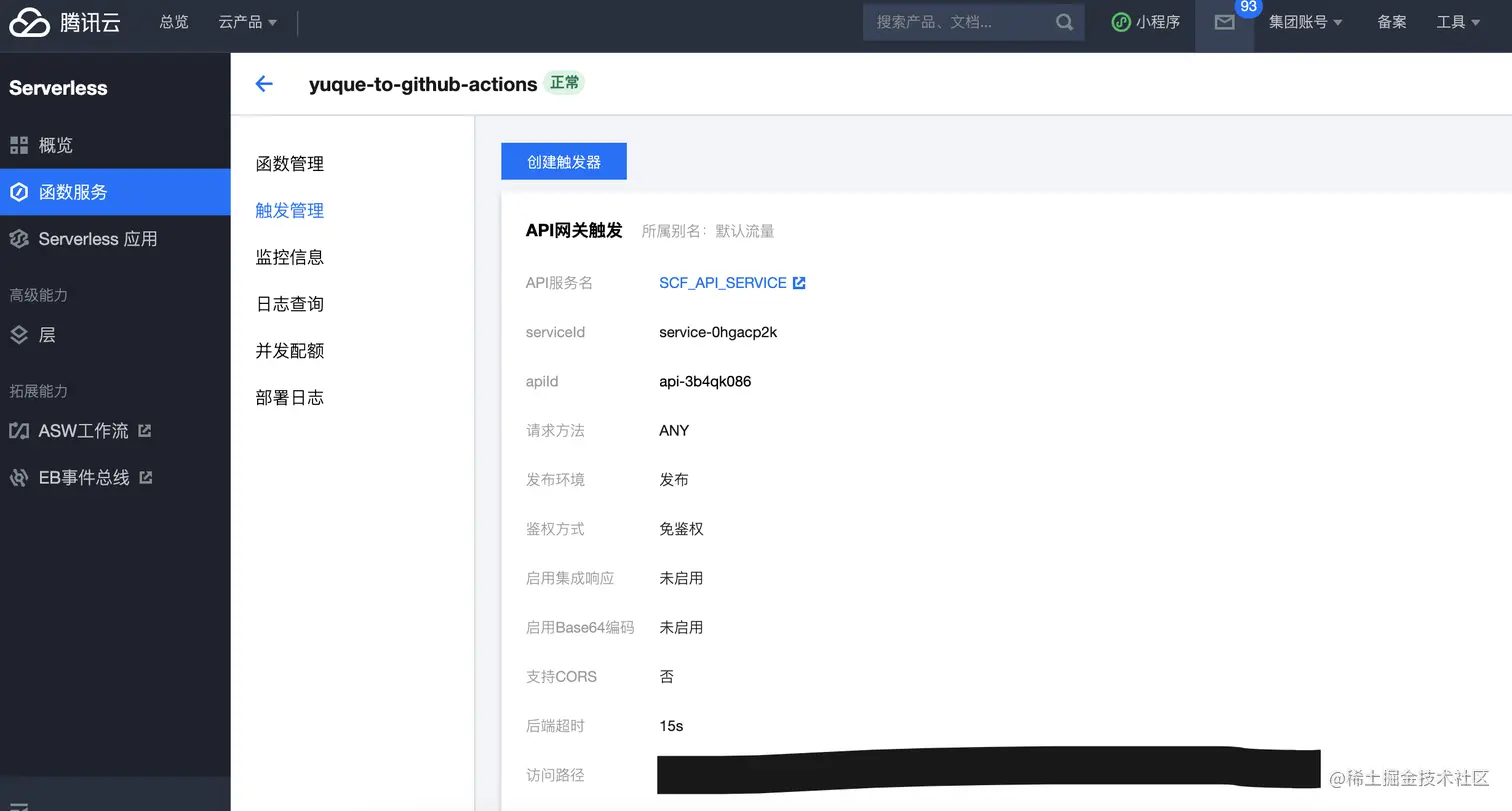 - 部署完成后进入触发管理,最下面就是云函数地址