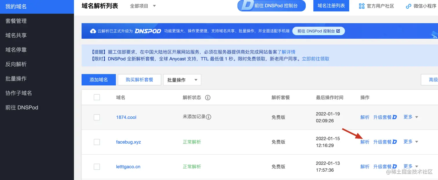 访问我的域名管理=>添加域名解析记录=>让域名指向上面的 CNAM 域名