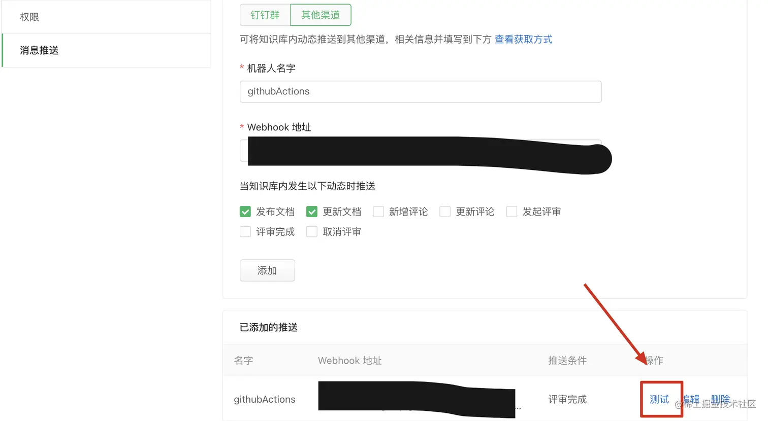 访问博客知识库=>设置=>消息推送,选择其他渠道,设置机器人名称和上文获取到的云函数地址,选择触发条件