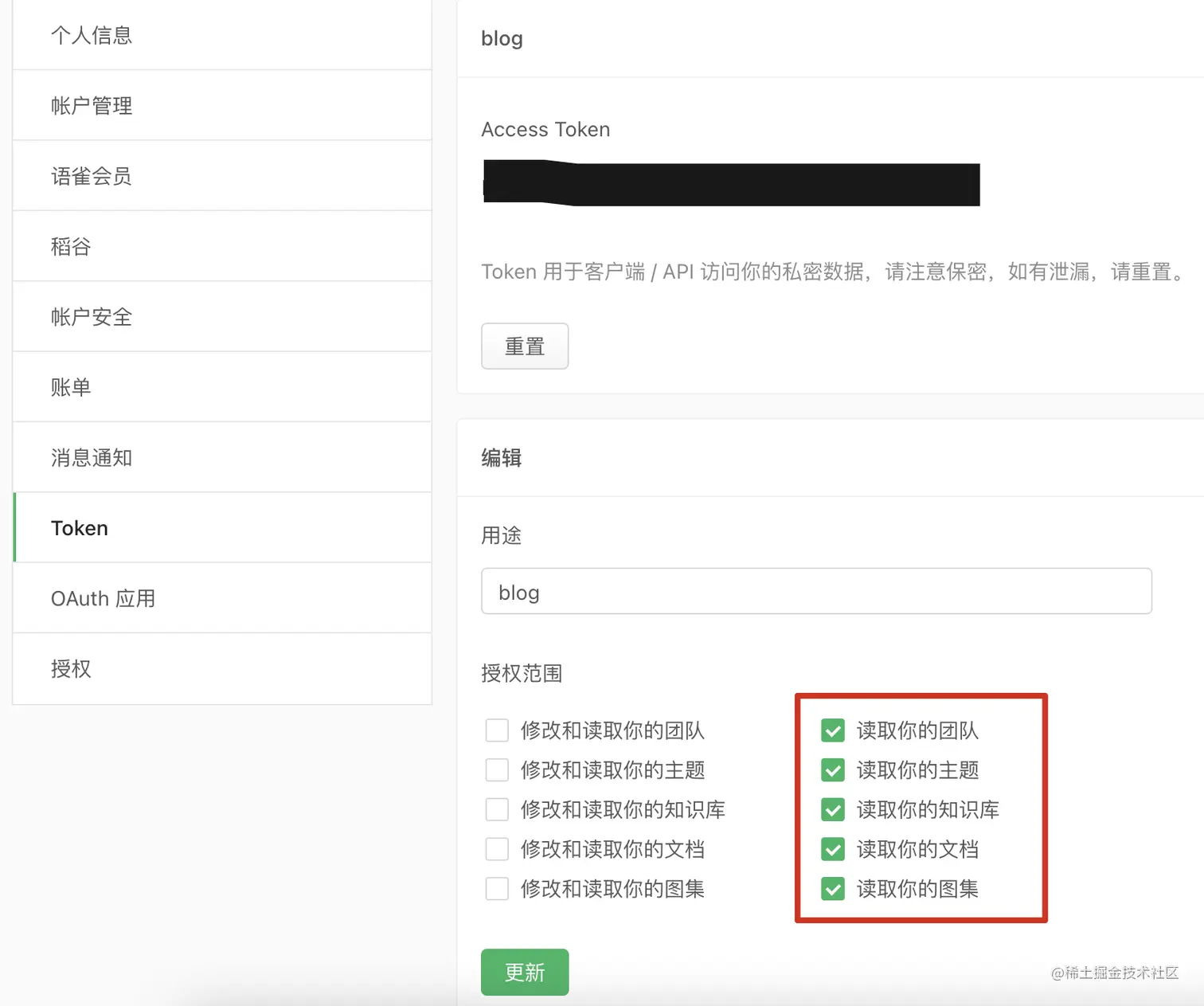 - 访问工作台=>账户设置=Token=>新建 token 并配置好权限。Access Token 即为 YUQUE_TOKEN