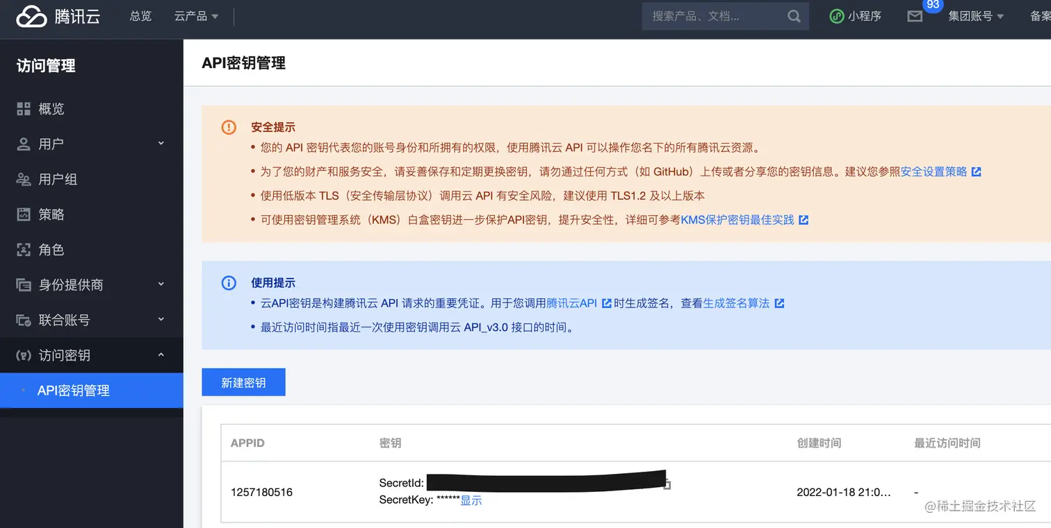 进入访问管理=>密钥管理=>【新增密钥】=>获取 SecretId 和 SecretKey