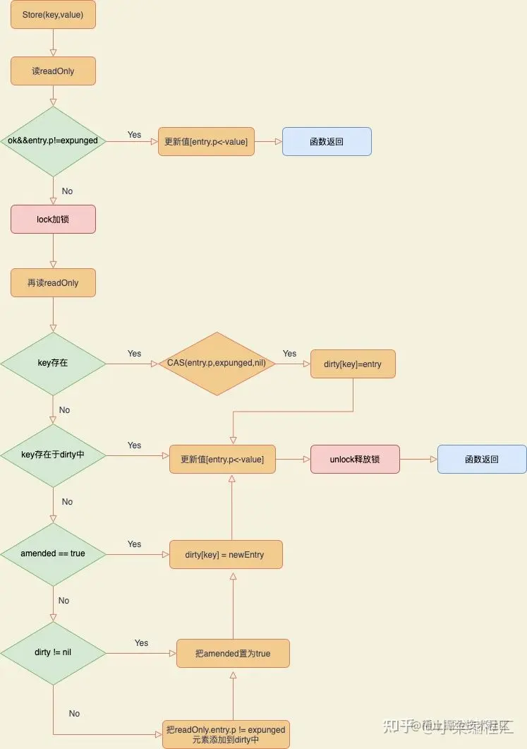 func (m *Map) Store(key, value interface{}) { // 把m.read转成结构体readOnly read, _ := m.read.Load().(readOnly) // 若key在readOnly.m中且entry.p不为expunged(没有标记成已删除)即key同时存在于readOnly.m和dirty // ,用CAS技术更新value 【注】:e.tryStore在entry.p == expunged时会立刻返回false,否则用CAS // 尝试更新对应的value, 更新成功会返回true if e, ok := read.m[key]; ok && e.tryStore(&value) { return } // key不存在于readOnly.m或者entry.p==expunged(entry被标记为已删除),加锁访问dirty m.mu.Lock() // 双重检测:若加锁前Map.dirty被提升为readOnly,则前面的read.m[key]可能无效,所以需要再次检测key是 // 否存在于readOnly中 read, _ = m.read.Load().(readOnly) // 若key在于readOnly.m中 if e, ok := read.m[key]; ok { // entry.p之前的状态是expunged,把它置为nil if e.unexpungeLocked() { // 之前dirty中没有此key,所以往dirty中添加此key m.dirty[key] = e } // 更新(把value的地址原子赋值给指针entry.p) e.storeLocked(&value) // 若key在dirty中 } else if e, ok := m.dirty[key]; ok { // 更新(把value的地址原子赋值给指针entry.p) e.storeLocked(&value) // 来了个新key } else { // dirty中没有新数据,往dirty中添加第一个新key if !read.amended { // 把readOnly中未标记为删除的数据拷贝到dirty中 m.dirtyLocked() // amended:true,因为现在dirty有readOnly中没有的key m.read.Store(readOnly{m: read.m, amended: true}) } // 把这个新的entry加到dirty中 m.dirty[key] = newEntry(value) } m.mu.Unlock() }