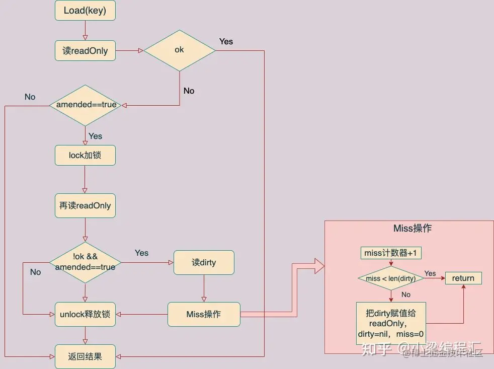 Load方法会优先无锁访问readOnly,未命中后如果Map.dirty中可能存在这个数据就会加锁访问Map.dirty