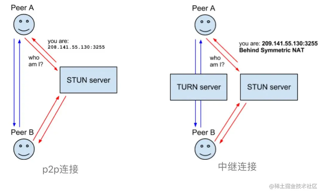 - STUN/TURN:STUN实现P2P型连接,TRUN实现中继型连接。两者实现均有标准协议。(参考下图)