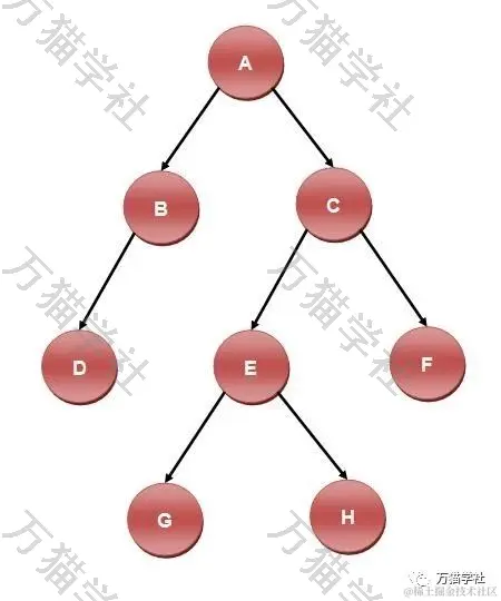 再看C的左子树(GEH),在前序遍历(ABDCEGHF)中,E在最前面,说明E为该子树的根结点,再看中序遍历(DBAGEHCF),E的左边(G)肯定为E的左子树,E的右边(H)肯定为E的右子树,可以最终判断出二叉树是这样的: