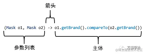 Lambda表达式由三部分组成,以上面的口罩排序的例子为例,如下图: