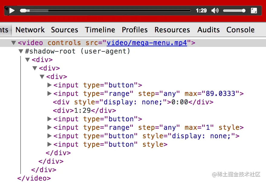打开控制台,可以看到 <template> 的 DOM 都被挂到 Shadow Root 上了: