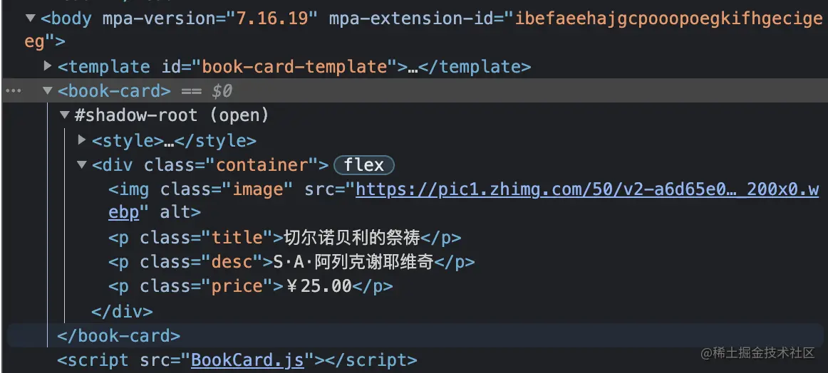因为浏览器不认识 <book-card> 所以,我们需要在 BookCard.js 里注册它,并在 index.html 中引入并执行 BookCard.js。