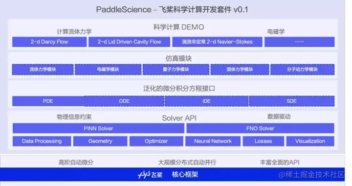 在底层核心框架层面,飞桨通过支持高阶自动微分,包含Jacobian/Hessian/傅里叶变换等科学计算API,来支持快速求解高阶偏微分方程。在套件层面,PaddleScience提供泛化的微分方程接口,如Navier-Stokes equation,并提供计算流体力学领域的方腔流、达西流等简单算例。