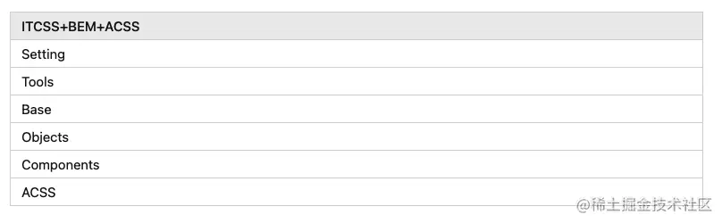 根据上表我们可以看出ITCSS分层更加精细,所以我们选择ITCSS,接着我们继续看ITCSS的Objects和Components层,它就相当于OOCSS且相当于开发Vue组件,所以我们在开发组件时使用选择OOCSS的进阶版BEM。我们知道如果一个项目全部使用ACSS的缺点跟明显,那么我们选择ACSS的原因是因为项目中可能会存在向字体大小的这种的样式,所以我们可以把这一类样式维护在ACSS目录中。Generic和Base类似所以只保留Base即可,我假设Trumps用不到,所以也去掉这一层。所以我们的架构现在就是下面这样。