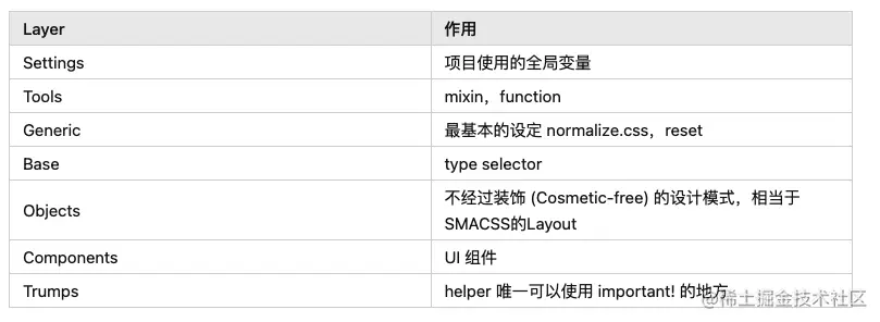 ITCSS的核心是分层,主要分为七层, 与SMACSS的分类相比更加精细,层次分的更细主要有: