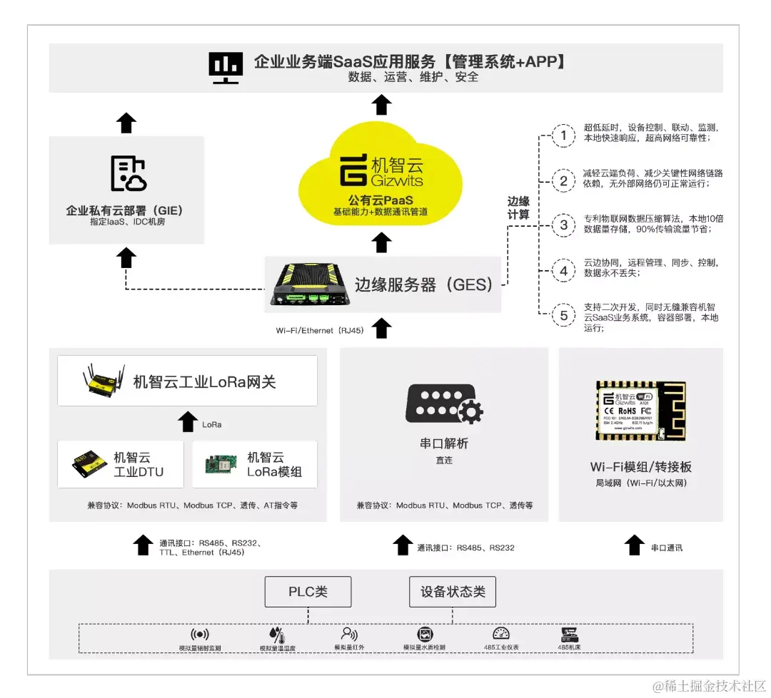 作为一套完整的软硬结合一站式解决方案,机智云AIoT云边协同智能解决方案通过基于物联网、大数据、人工智能的机智云AIoT云平台,可实现异构工业物联网基础设施接入与管理、海量工业实时数据分析和决策;通过机智云工业DTU/网关数据采集器、机智云边缘服务器硬件(GES)和机智云边缘管理系统(GEMS),快速实现设备端的高效数据采集、释放边缘计算能力。