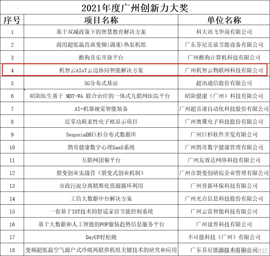 近期,由广州市科学技术局指导、广州创新企业联盟主办、混沌学园广深分社协办的“2021年度广州创新力大奖”名单正式公布,机智云AIoT云边协同智能解决方案入选榜单。