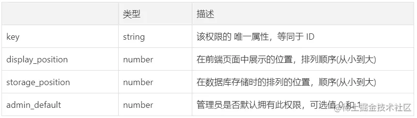 - 配置文件主要存储的是权限列表,系统内置,前端也需要一份配置是因为列表展示位置匹配。