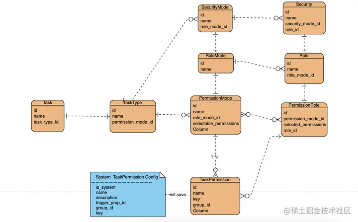 TaskPermission:任务权限字典表,是通过系统配置文件(system task permissions) 初始化到该表中的,与权限模式 的关系是多对一,一个权限模式对应多个权限项,关联字段 selectable_permission,注意该字段是同步到 权限模式下,后续供角色来选择。