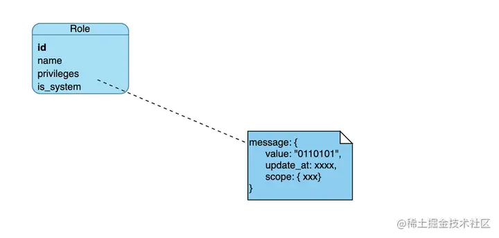在Worktile中只需要一张角色表足矣!结构如下(关键字段): id,name,privileges,is_system,其中核心字段是privileges,该字段记录的是权限项,是一个json,详细如右下图。
