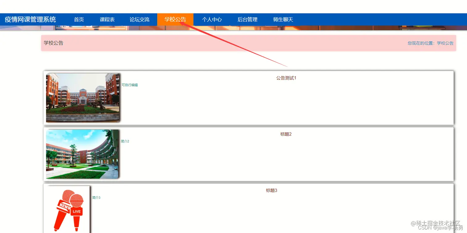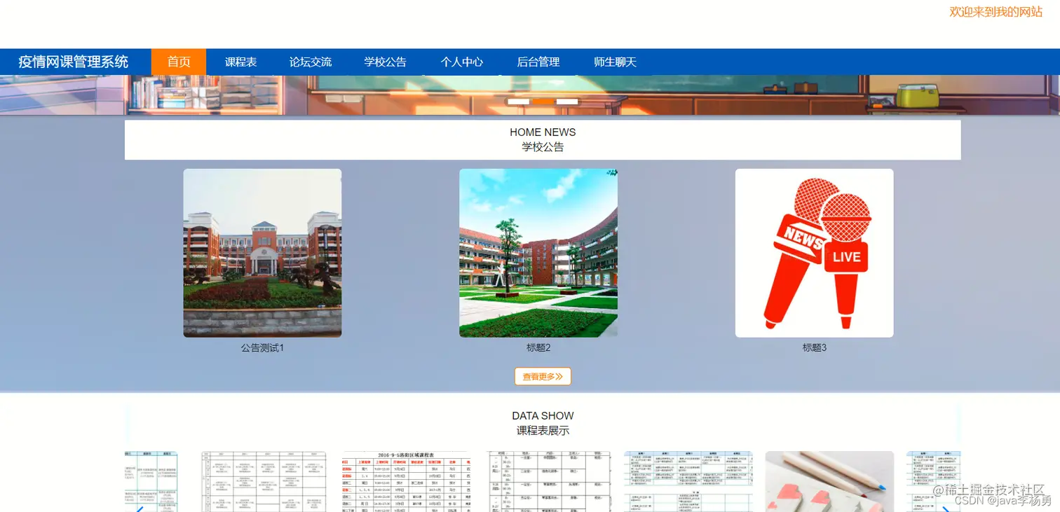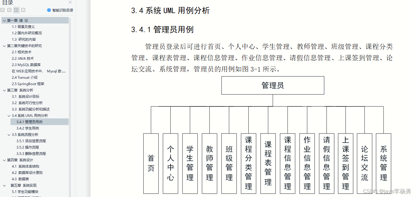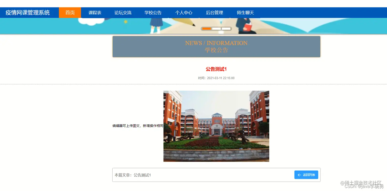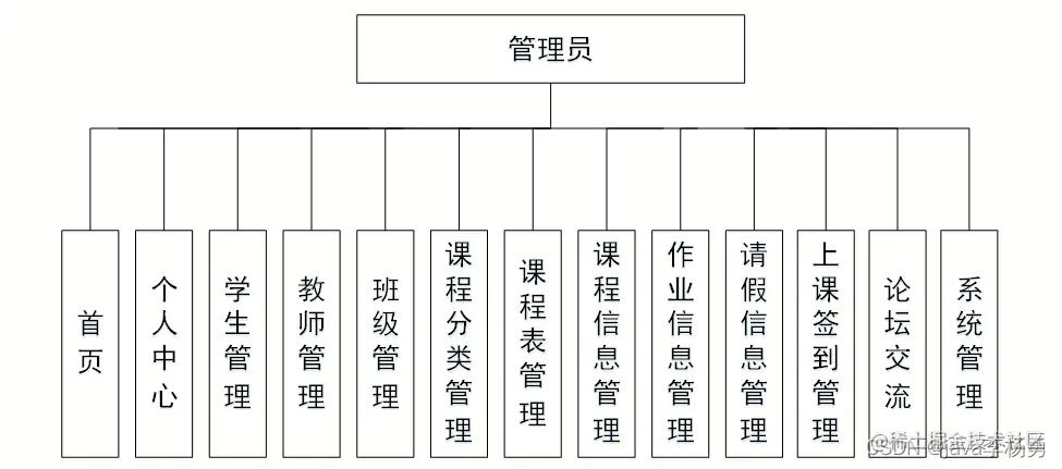 管理员: 管理员登录后可进行首页、个人中心、学生管理、教师管理、班级管理、课程分类管理、课程表管理、课程信息管理、作业信息管理、请假信息管理、上课签到管理、论坛交流、系统管理等。