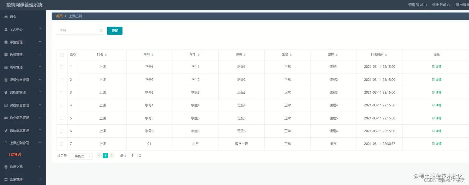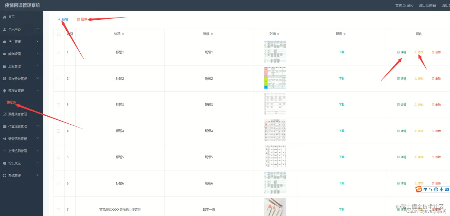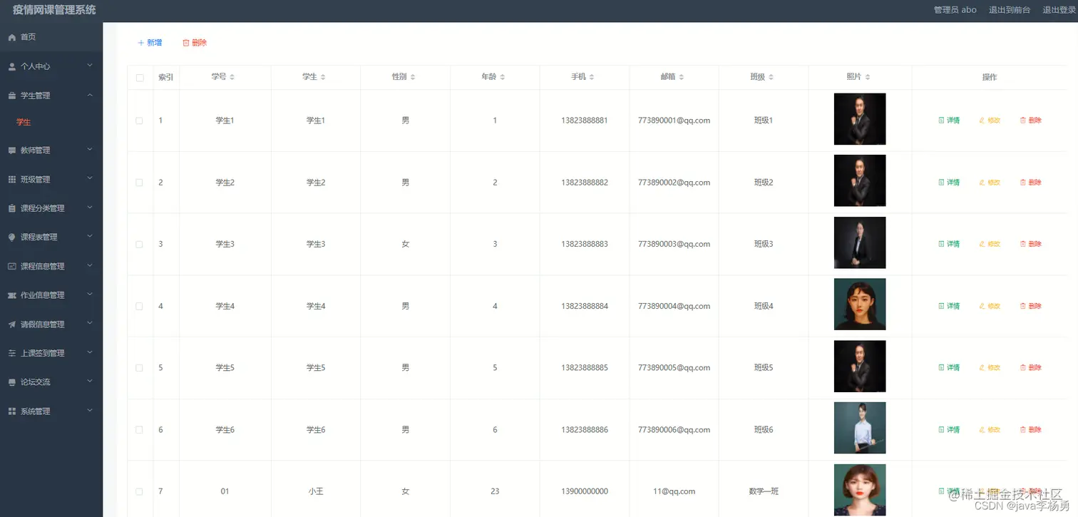后台管理员: 管理员登录系统后可进行首页、个人中心、学生管理、教师管理、班级管理、课程分类管理、课程表管理、课程信息管理、作业信息管理、请假信息管理、上课签到管理、论坛交流、系统管理等操作。