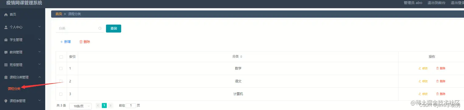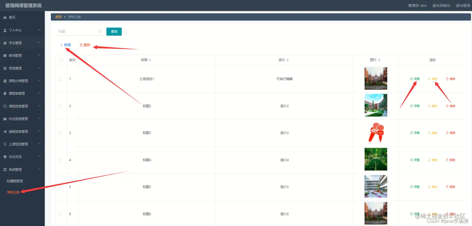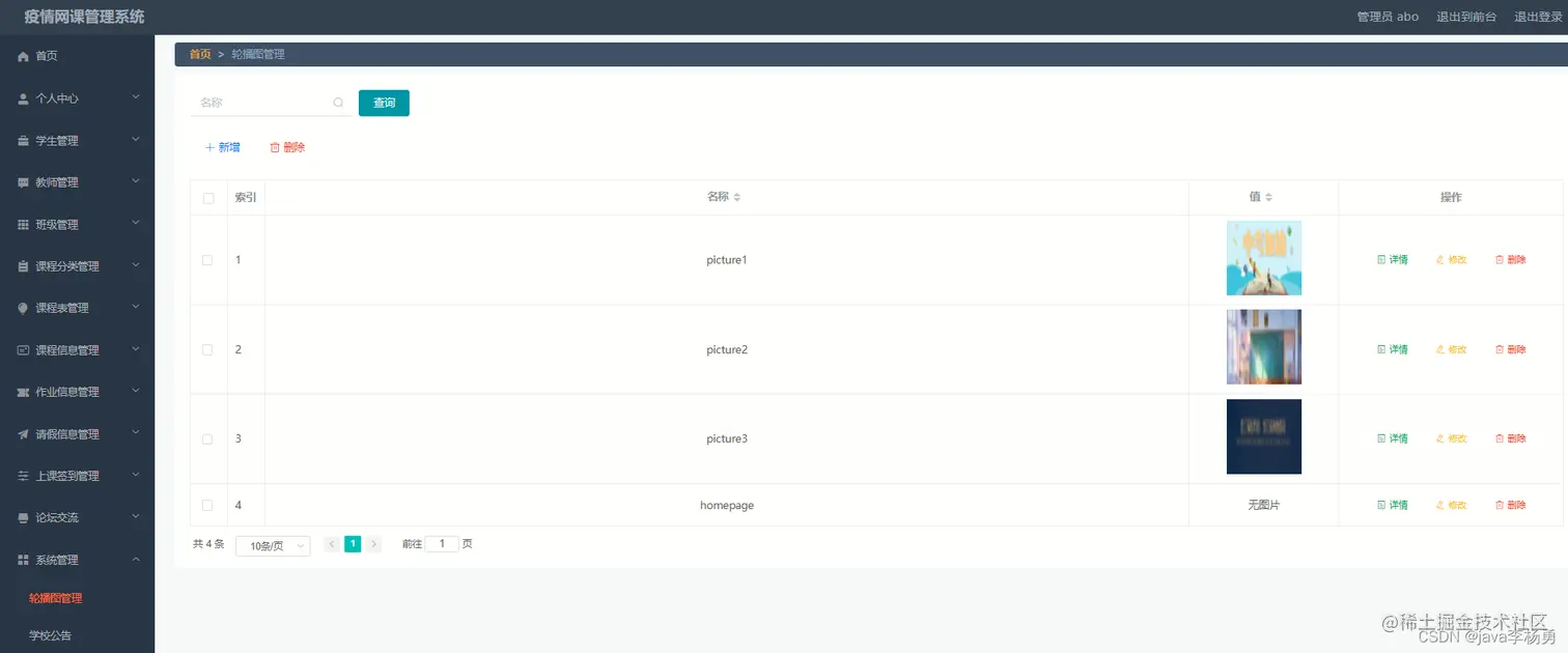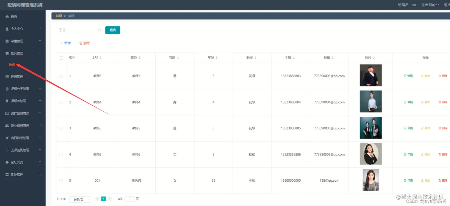 后台管理员: 管理员登录系统后可进行首页、个人中心、学生管理、教师管理、班级管理、课程分类管理、课程表管理、课程信息管理、作业信息管理、请假信息管理、上课签到管理、论坛交流、系统管理等操作。
