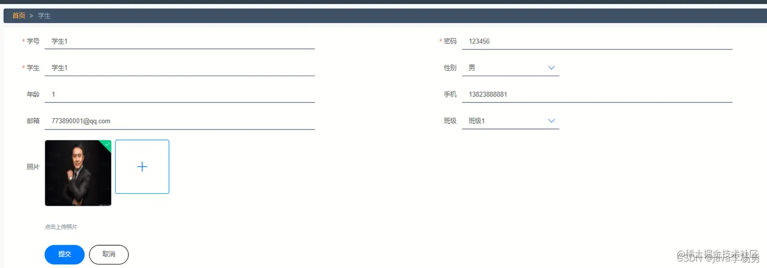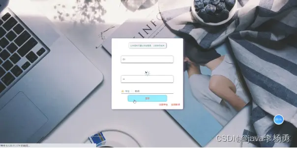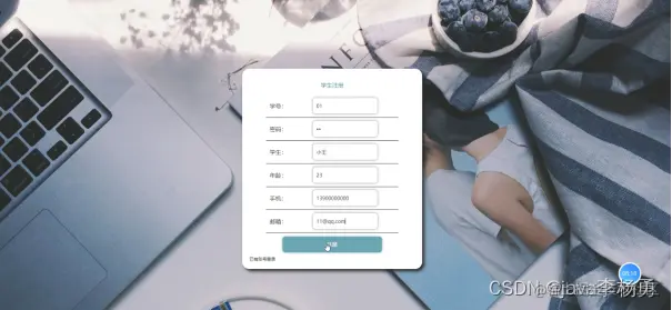 学生注册 :在学生注册页面可以填写学号、密码、学生、年龄、手机、邮箱等信息进行注册