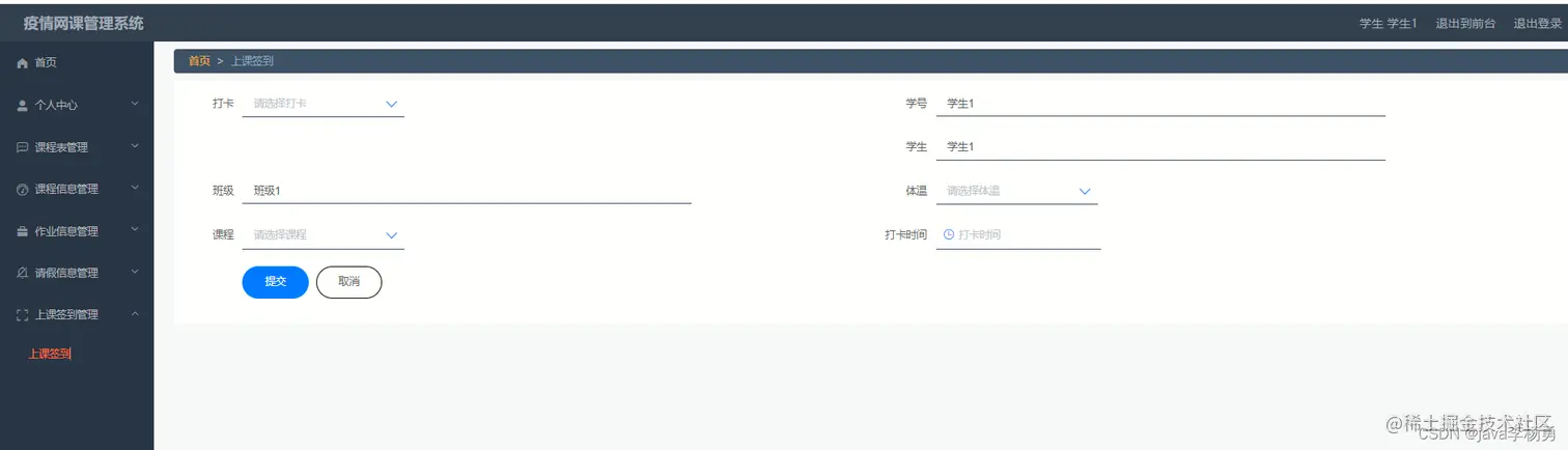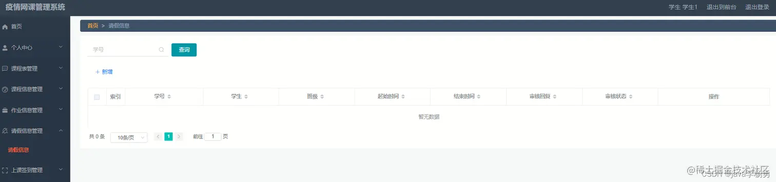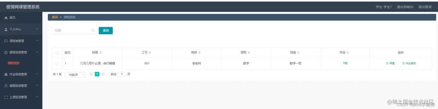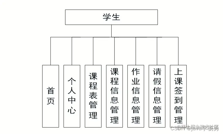 学生用户: 学生注册登录后可进行首页、个人中心、课程表管理、课程信息管理、作业信息管理、请假信息管理、上课签到管理