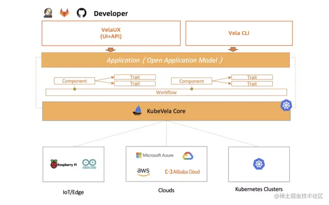 - 面对开发工具链的差异,企业中可能已经存在不同的开发工具链,产出不同的业务制品。KubeVela 通过扩展和标准模型去支持各类制品,实现其标准化交付。当然,它的标准逐步衍生到前置环节,帮助企业逐步实现工具链一致化。因此,你不用担心你是用的 Gitlab 还是 Jenkins,它都能对接。