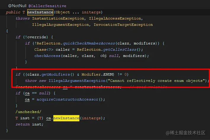 在 newInstance()方法中做了强制性的判断,如果修饰符是 Modifier.ENUM 枚举类型,直接抛出异常。