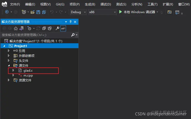 GLAD现在应该提供给你了一个zip压缩文件,包含两个头文件目录,和一个glad.c文件。将两个头文件目录(glad和KHR)复制到你的Include文件夹中,并添加glad.c文件到你的工程中。