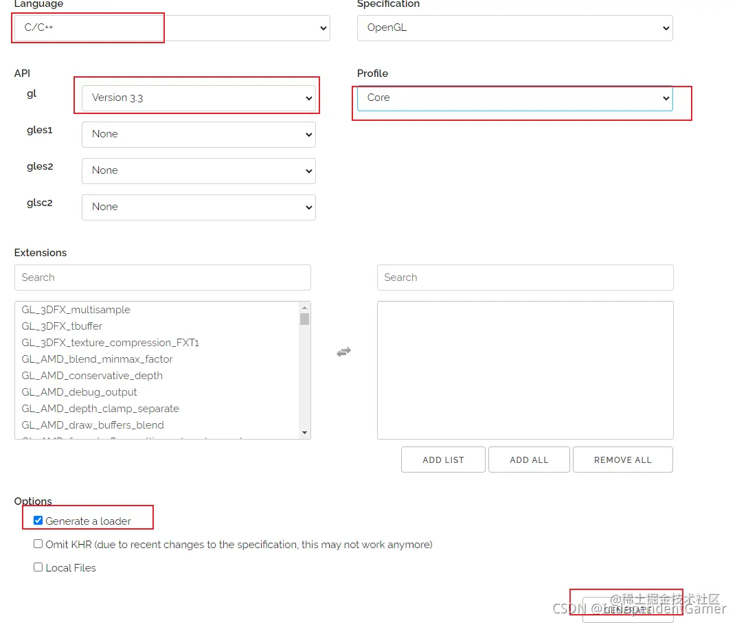 http://glad.dav1d.de/在这里我们能够告诉GLAD需要定义的OpenGL版本,并且根据这个版本加载所有相关的OpenGL函数。
