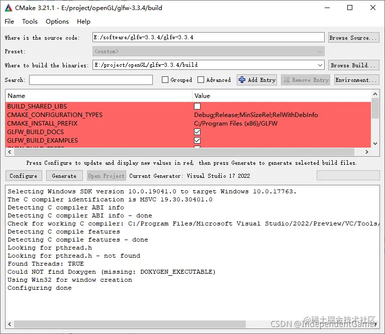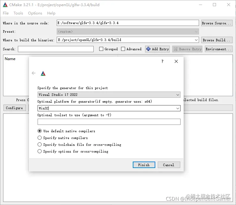 接下来,打开CMake开始配置,CMake需要一个源代码目录和一个存放编译结果的目标文件目录。源代码目录我们选择GLFW的源代码的根目录,然后我们新建一个 build 文件夹,选中作为目标目录。点击Finish 会自动编译完成: