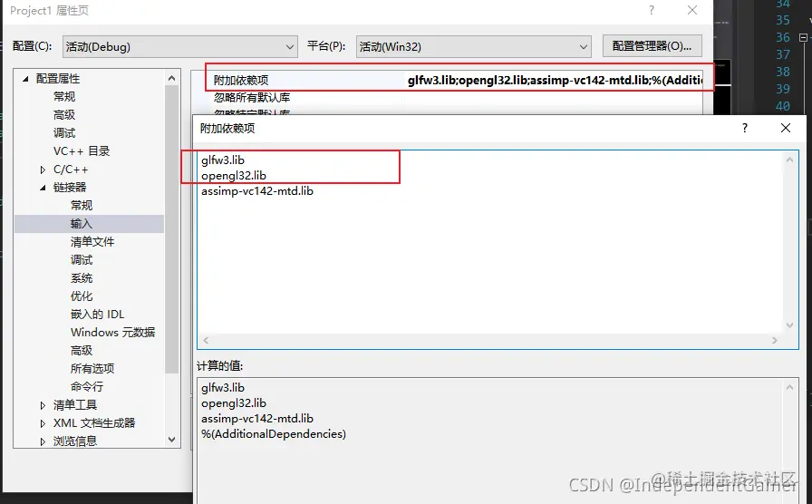 现在VS可以找到所需的所有文件了。最后需要在Linker(链接器) 选项卡里的Input(输入) 选项卡里添加glfw3.lib这个文件: