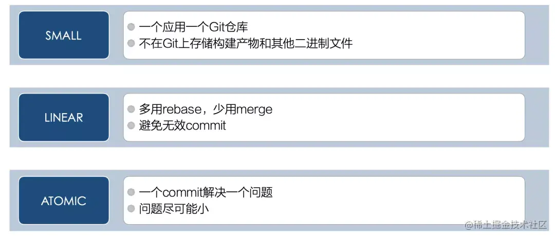 避免无意义的merge,尽量用rebase操作。其次是避免无效commit,有很多代码库commit记录很长,但是里面80%都是无效的,例如都是fix1、fix2这样的commit,都却不知道它具体做了些什么,这种显然是不合理的,对于这种冗长的commit列表,有时候可以在merge的时候squash一下。