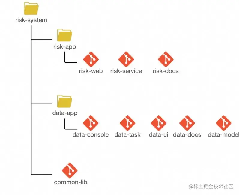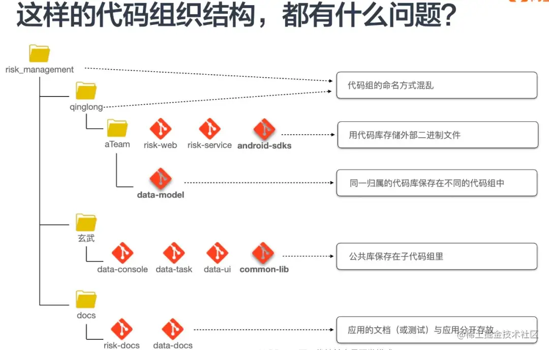 如上图所示,整个代码库是一个系统,这个系统有两个应用,一个是risk,一个是data。每个应用下面是有很多的服务和文档。它们有一个公共的Model,叫common-lib,这是被所有的应用所依赖的。所以我们把属于同一个应用的Git仓库放在一起,让common放到该有的地方去。不是按照团队,而是按照应用组划分,这样划分,结构就更加清晰了。这里我们稍微总结了一些实践的建议。