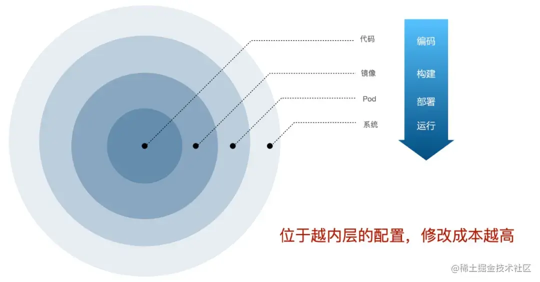 从另外的角度看一下配置,它有不同的层次,代码、镜像、Pod和系统。代码中的配置位于最内层,修改成本是最高的。因此,如果是编码级别的修改,要经过所有的阶段才能上线。如果运行阶段的话,我是不需要动前面的部分。
