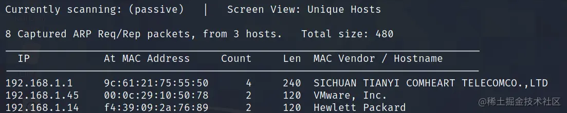 4、使用netdiscover进行被动方式探测局域网中存活的机器