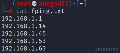 fping.txt 表示将扫描的结果重定向到fping.txt ,原因是如果扫描一个网段的话输出结果是非常多的,我们输出重定向到文件中只会获得存活的主机信息。